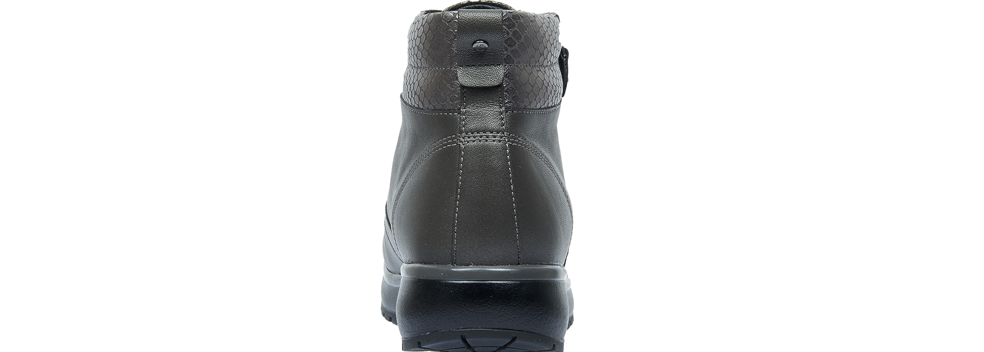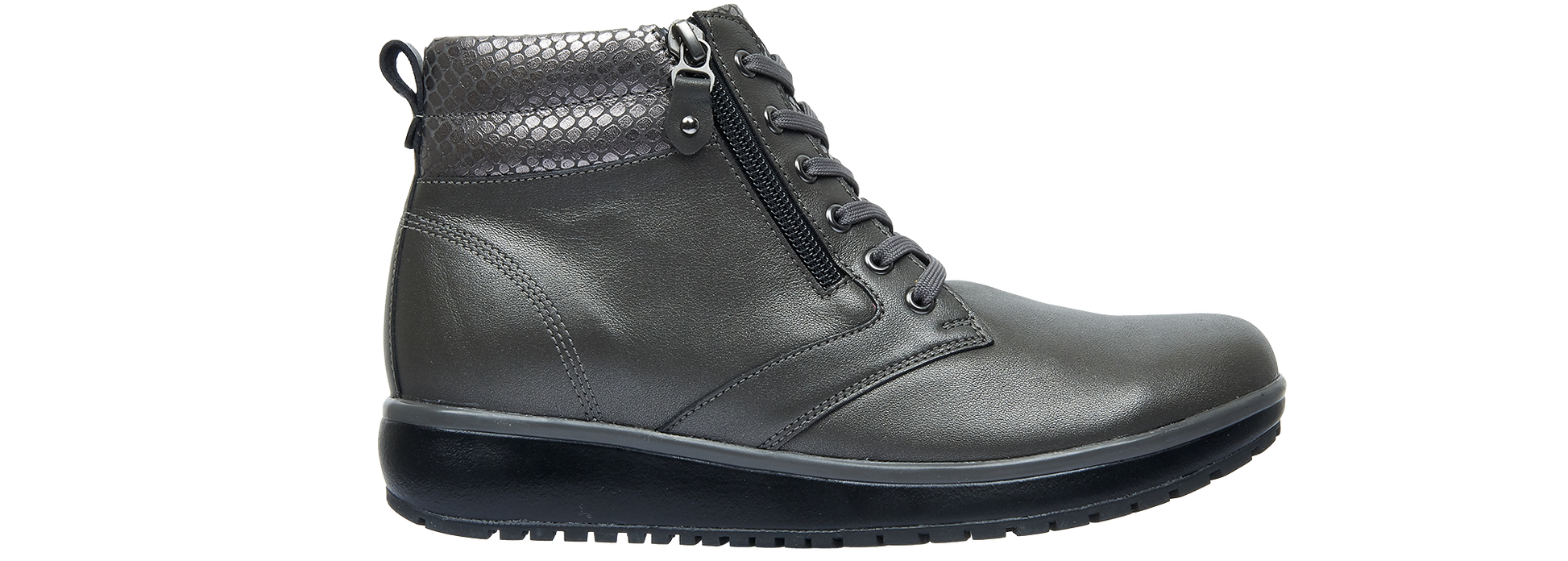 Midcut-Stiefel aus Perl-Vollleder mit Lederfutter. Dieser Style hat einen Reissverschluss neben der Frontschnürung, der das An- und Ausziehen von Schuhen erleichtert. Das weich gepolsterte Innenfutter sorgt für eine weiche und bequeme Passform. Passt besonders für Menschen mit einem breiten empfindlichen Vorfussbereich. Die stark dämpfende Sohle entlastet Ihre Rückenmuskulatur und Gelenke optimal. Geeignet für Menschen mit empfindlichem Rücken und mit Füssen und Gelenken, die täglicher Belastung ausgesetzt sind.