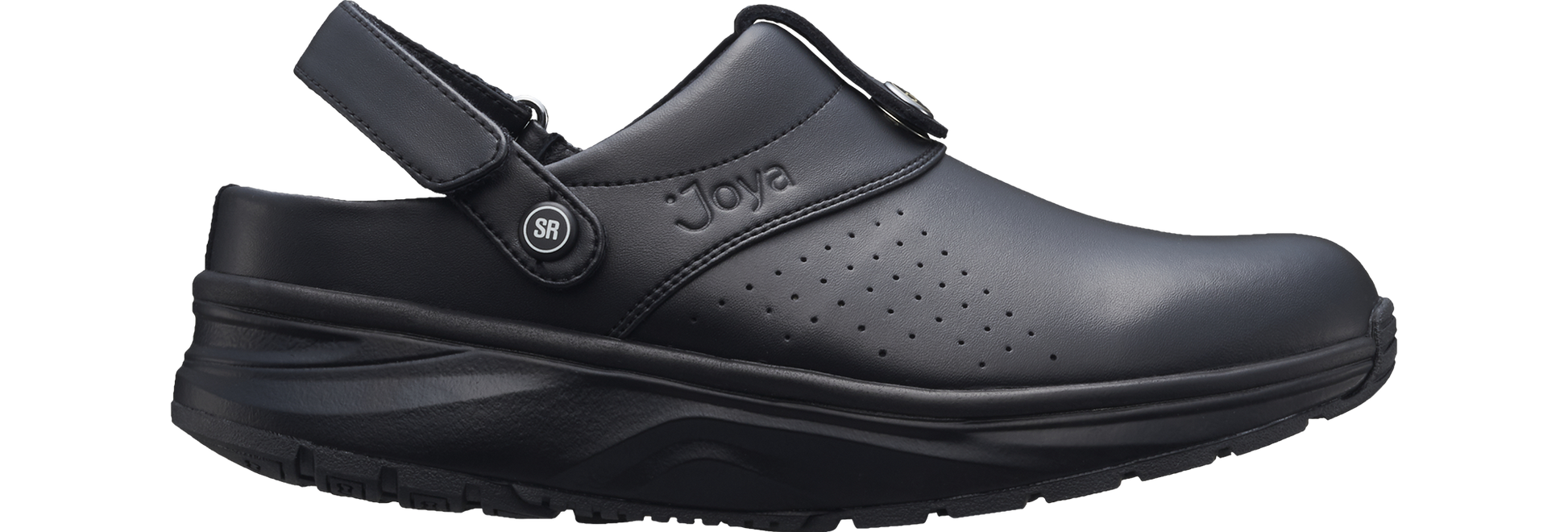 Clog mit verstellbarem Klettverschluss-Rückenriemen, Leder- und Textilfutter, besonders geeignet als Arbeitsschuh. Rutschfeste Sohle für zusätzliche Sicherheit am Arbeitsplatz. Basierend auf der Joya Active Sohlentechnologie, die eine ideale Kombination aus Dämpfung, Rückprall und Stabilität garantiert. Für dynamische Menschen, die Komfort in Bewegung und Leistung auf jedem Untergrund benötigen.