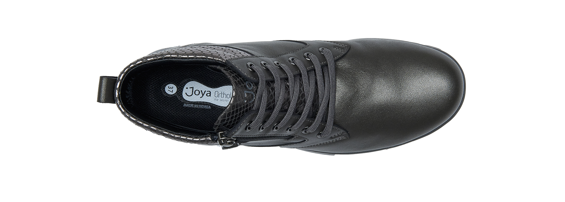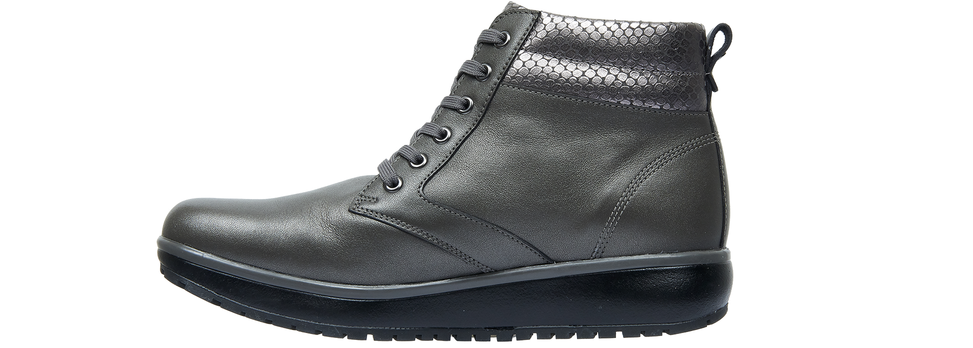 Midcut boots in pearl full grain leather with leather lining. This style has a zipper on the side of the front lacing which helps to easy put on - take off shoes. Soft padded lining on the front provides soft and comfortable fitting. Will especially for the people with a wide sensitive forefoot area. Sole with a strong cushioning effect provides optimum relief for your back muscles and joints. Suitable for people with a sensitive back and with feet and joints exposed to daily stress.
