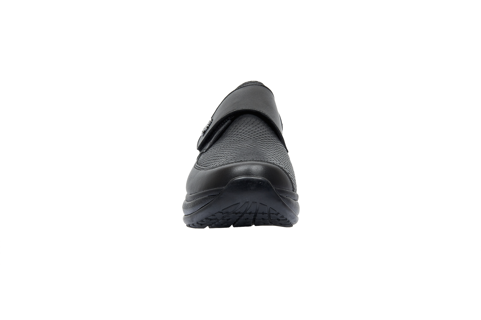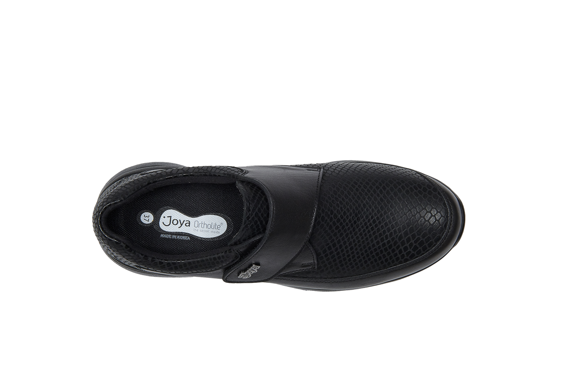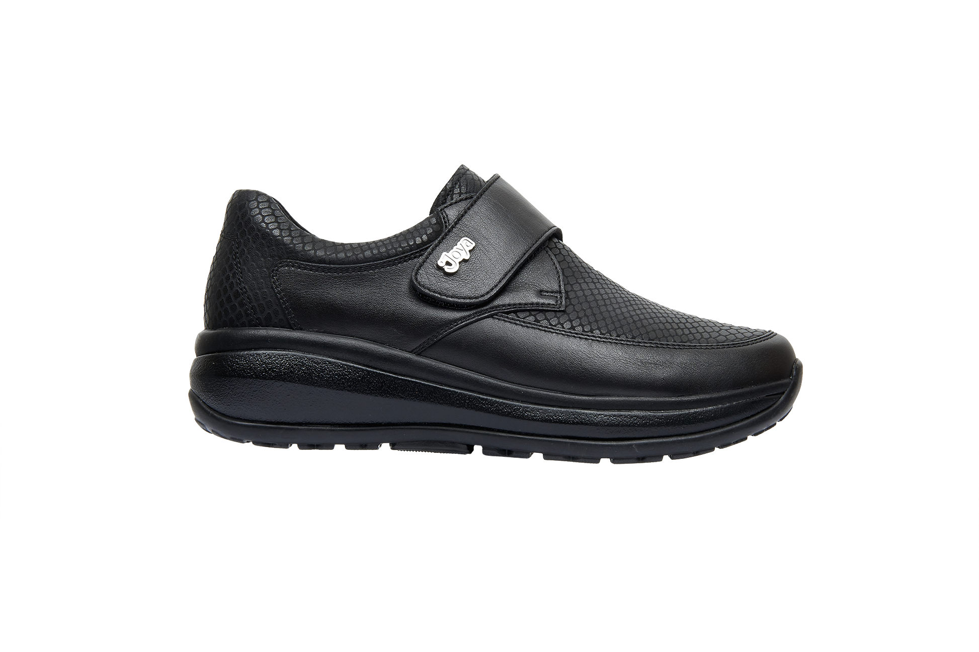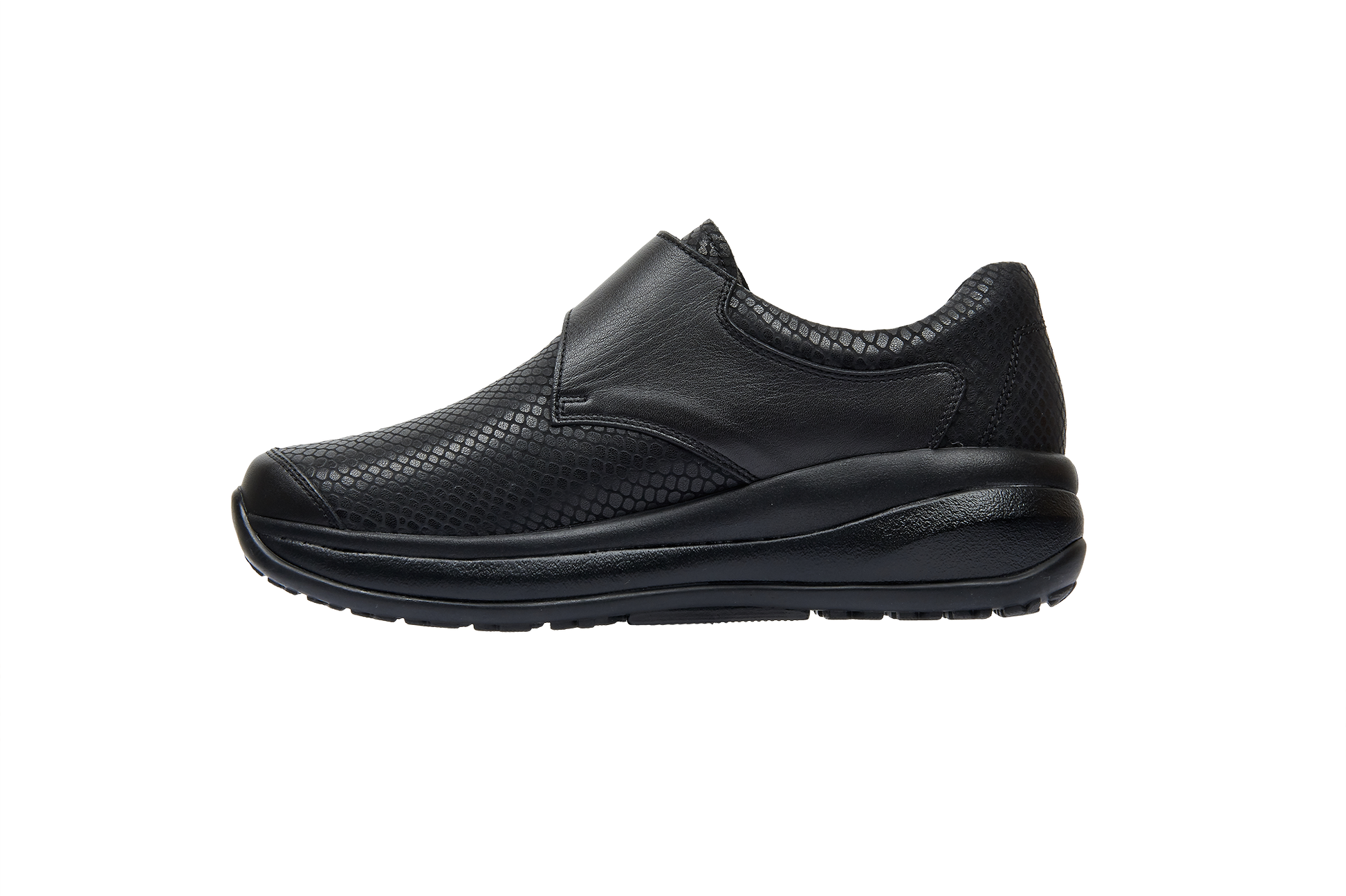 Leather shoes with front velcro closure. Upper in combination of soft full grain leather and reptile embossed leather. Extra soft padded lining on the front provides soft and comfortable fitting, especially will fit for the people with a sensitive forefoot area. Sole with a strong cushioning effect provides optimum relief for your back muscles and joints. Suitable for people with a sensitive back and with feet and joints exposed to daily stress.